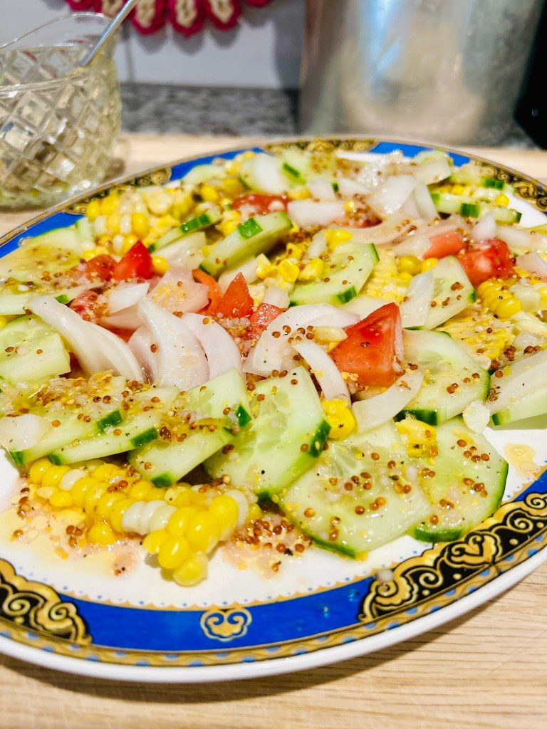I love them in caprese salad with mozzarella and basil, sandwiched between sourdough with mayo and onion …and pictured here with Vidalia onion, cucumber and leftover corn I chilled and cut off the cob. Drizzled with my homemade French Vinaigrette… it’s the perfect side dish for these hot and humid days we’ll be having on into late fall.